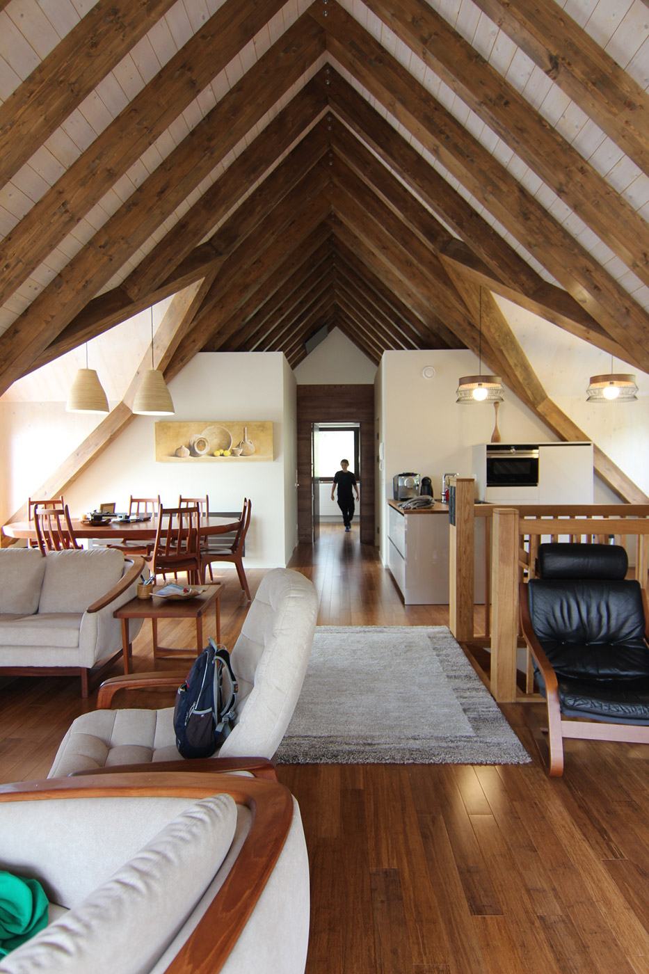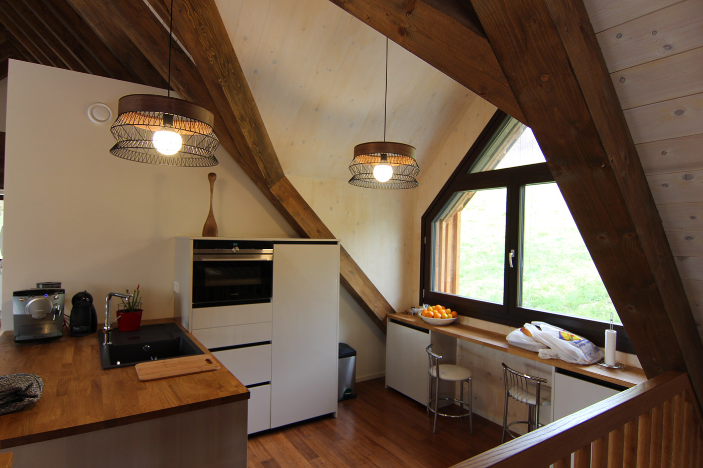 La solución es una planta baja funcional de distribución y materiales para el taller y garajes. En la planta superior se crea una vivienda con distribución sencilla, abriendo espacio y vistas mediante buhardillas, creando un lugar amplio y lujoso.