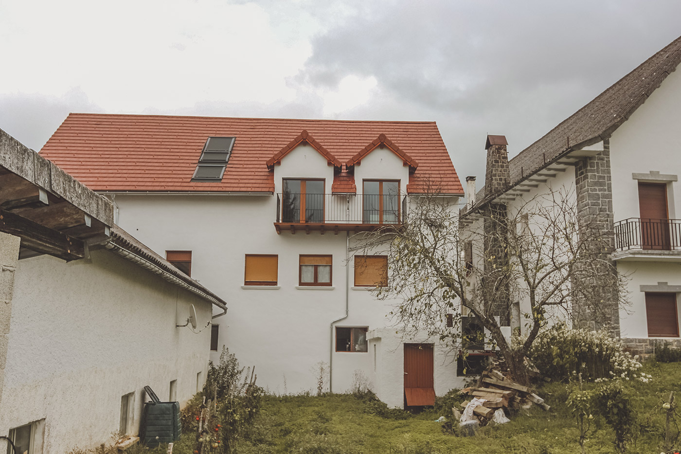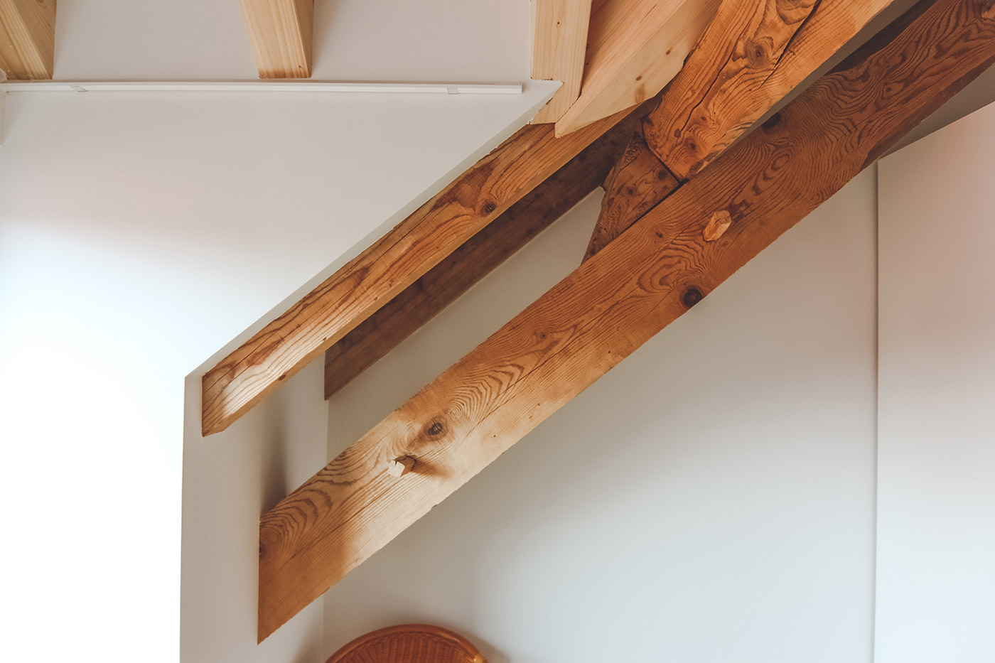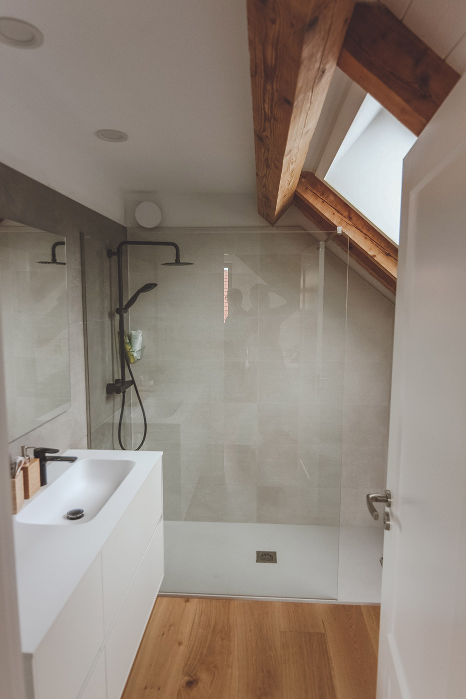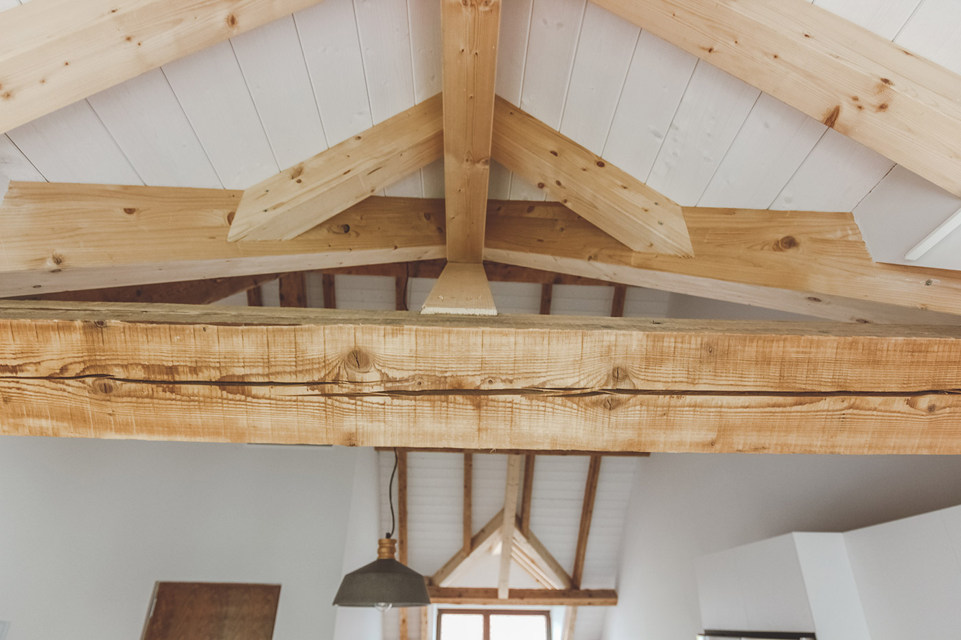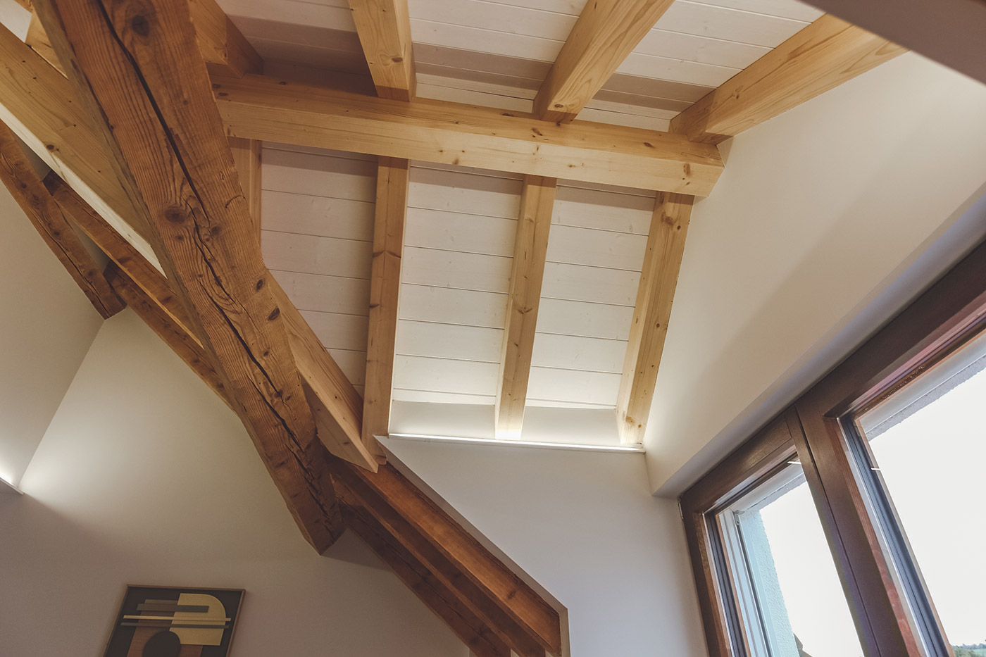 En la nueva vivienda se aprovecha la estructura existente de la cubierta introduciendo en puntos especificos nuevas buhardillas para dar luz y espacio a las estancias. Se juega con contrastes con la estructura nueva frenta a la vieja y espacios con alturas de 2,5m a 5m.